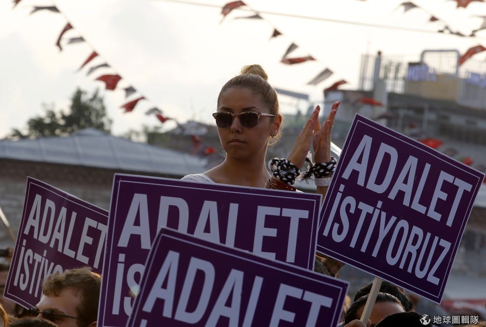 照片中,土國示威民眾舉著「我們要求正義」的牌子。