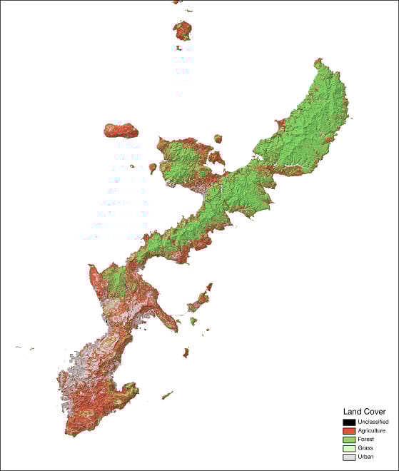 比起沖繩本島北部開發度較低的區域,南部的市區街道較多,鳥和動物的聲音較少。地圖中的紅褐色代表農業用地,深綠色是森森,淡綠色是草地,灰色是市區,黑色則為不明地區。