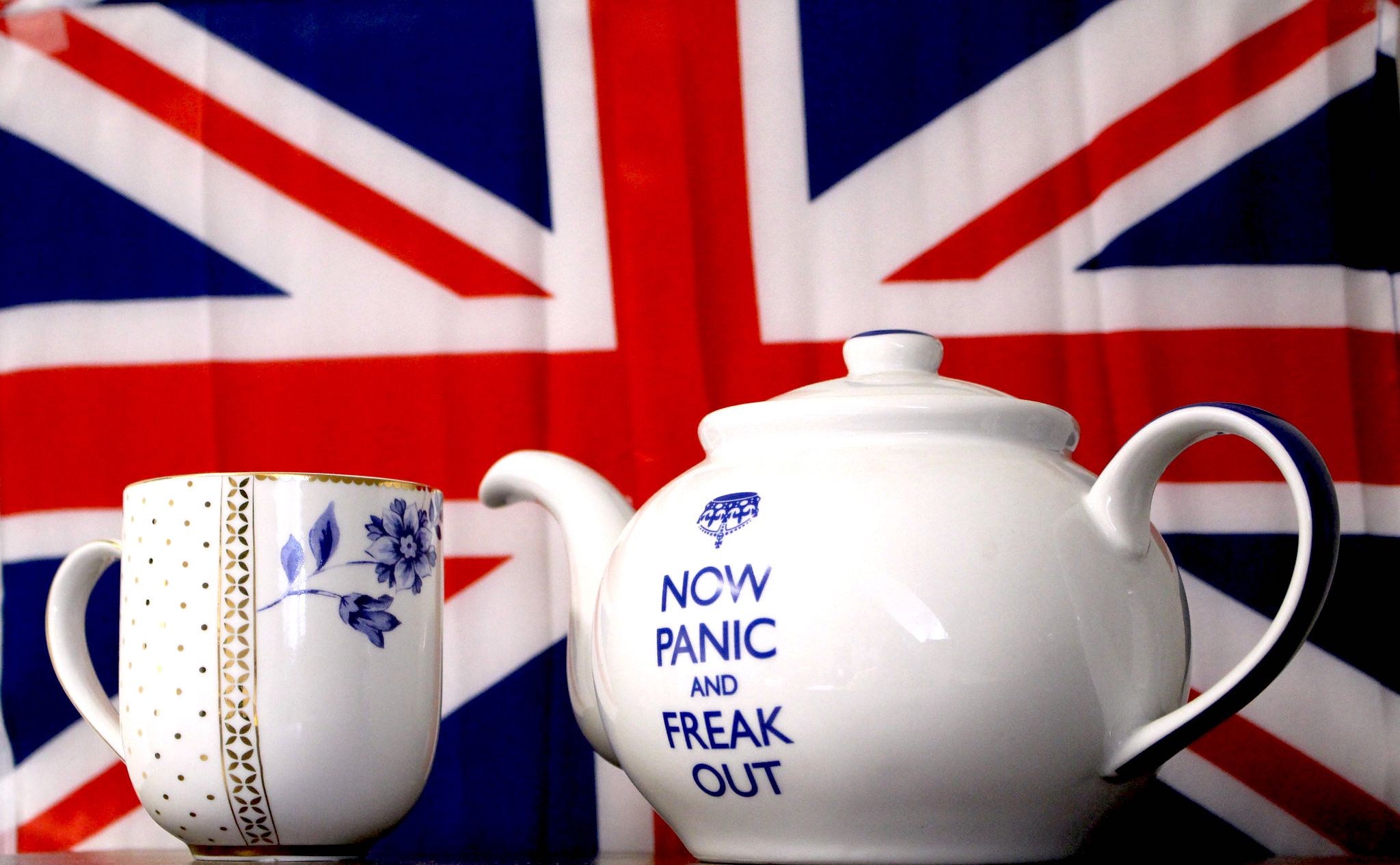 一組茶壺上寫著「現在驚慌然後恐慌吧」來形容現在英國脫歐的情況,這句話是改自英國二戰標語「保持冷静,繼續前進」(Keep Calm and Carry On)。