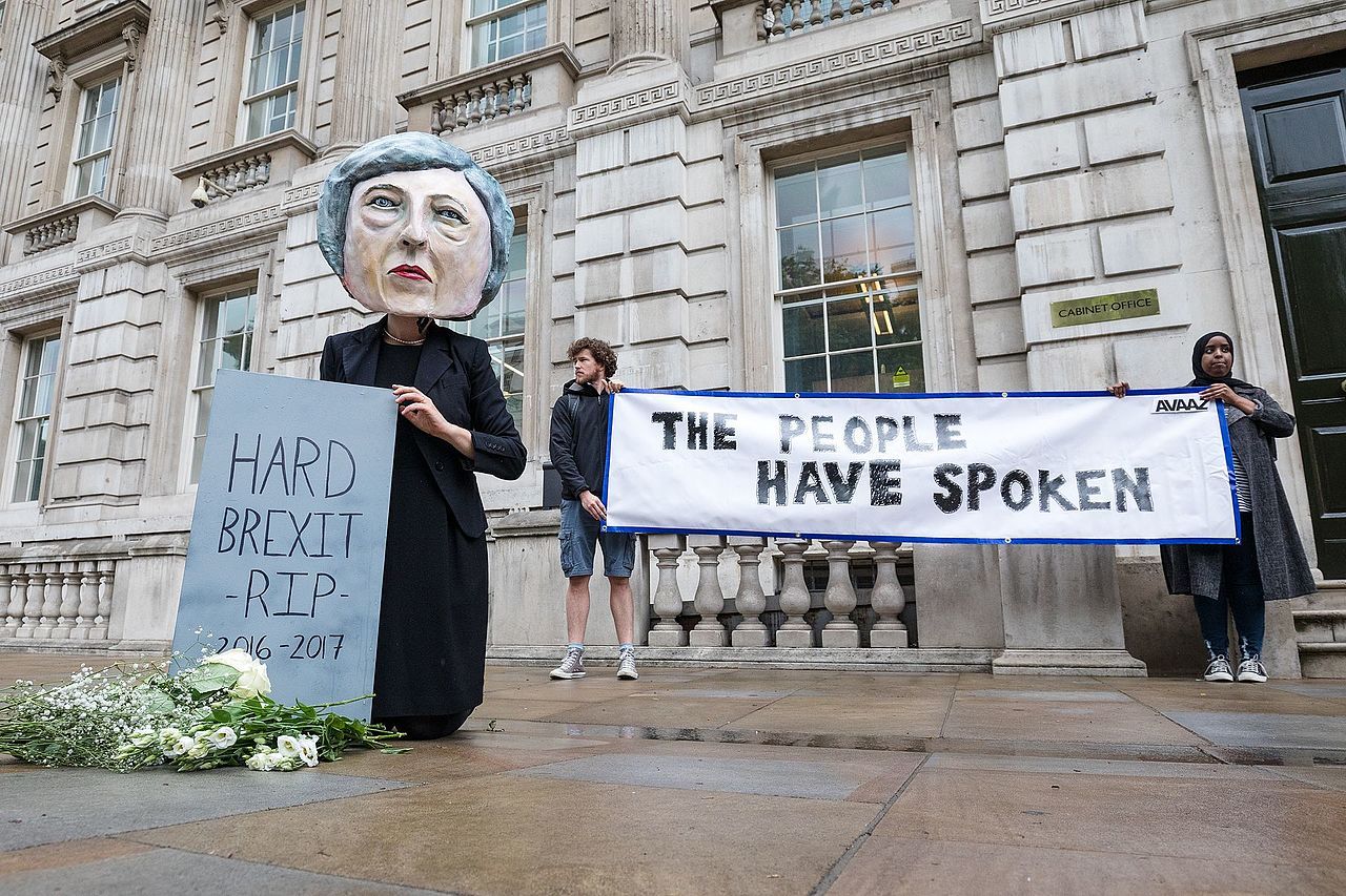 今年 6月,在英國首相梅伊宣布要提前改選國會後,一群示威團體前往英國內閣辦公廳抗議梅伊的「硬脫歐」政策。