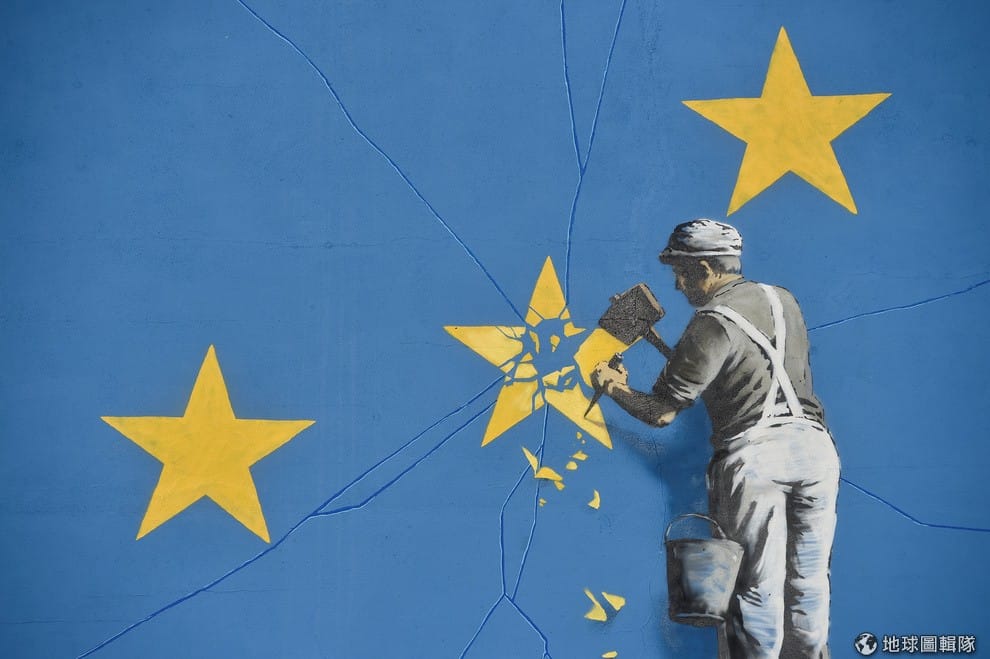 圖為英國塗鴉藝術家班克斯(Banksy)位在英國肯特郡(Kent)多佛(Dover)港的壁畫作品,上頭描繪了一名工匠手拿鑿子敲碎了歐盟旗幟中的一顆五角星,藉此描繪出英國脫歐之後的歐盟。