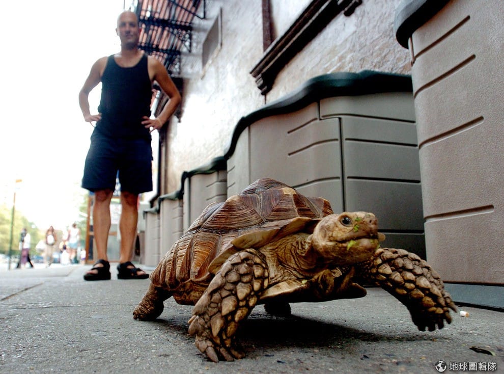 蘇卡達象龜「減速」(Speedbump)跟主人一起在曼哈頓的大街上趴趴走