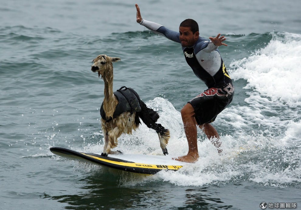 祕魯的衝浪好手多明哥正在教草尼馬皮斯科怎麼穩穩地站在浪板前端,多明哥教狗狗衝浪已經有10多年的經驗,但這是他第一次碰上「草泥馬學員」,一人一羊駝在海面上衝浪非常引人注目