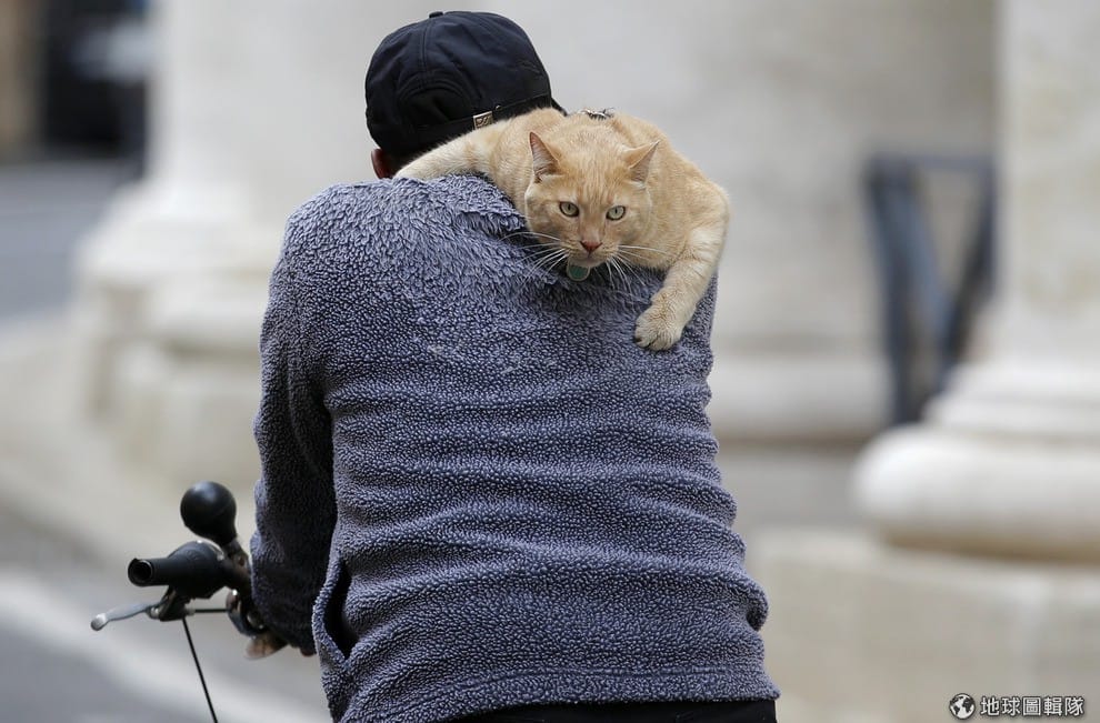 羅馬大街上,一隻貓咪表情不太情願地半趴在騎腳踏車的主人身上