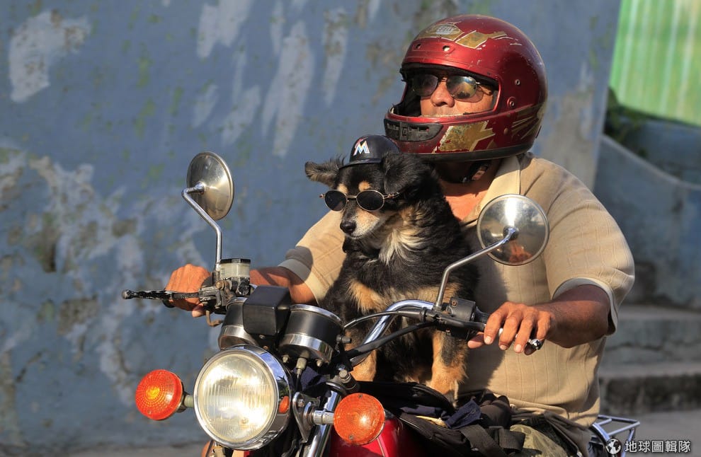 已經14歲的波比(Popy)是個年紀不小的成熟狗狗,這天牠換上跟主人一樣的帥氣墨鏡,一起騎著機車在哈瓦那城市中兜風。