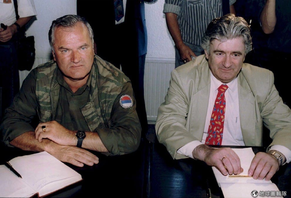 路透社圖為當年發動斯雷布雷尼察大屠殺的兩名戰犯──塞族共和國將軍姆拉迪奇(左)和塞族共和國總統卡拉季奇(Radovan Karadzic, 右)。