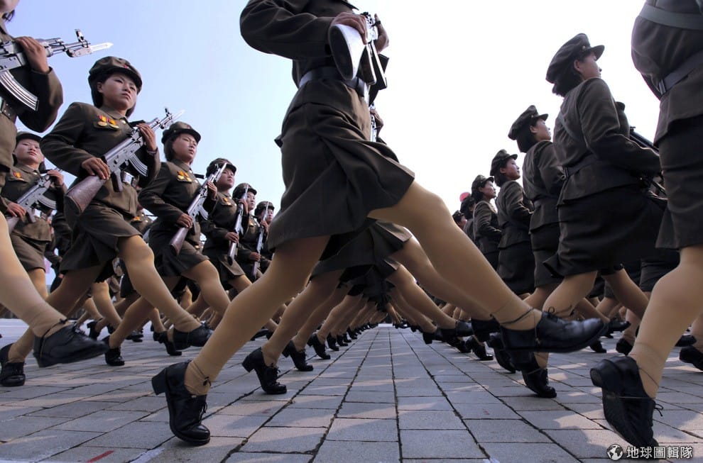 2010年 10月,北韓女兵踏著整齊劃一的步伐進行軍事遊行,藉此紀念朝鮮勞動黨成立 65周年。