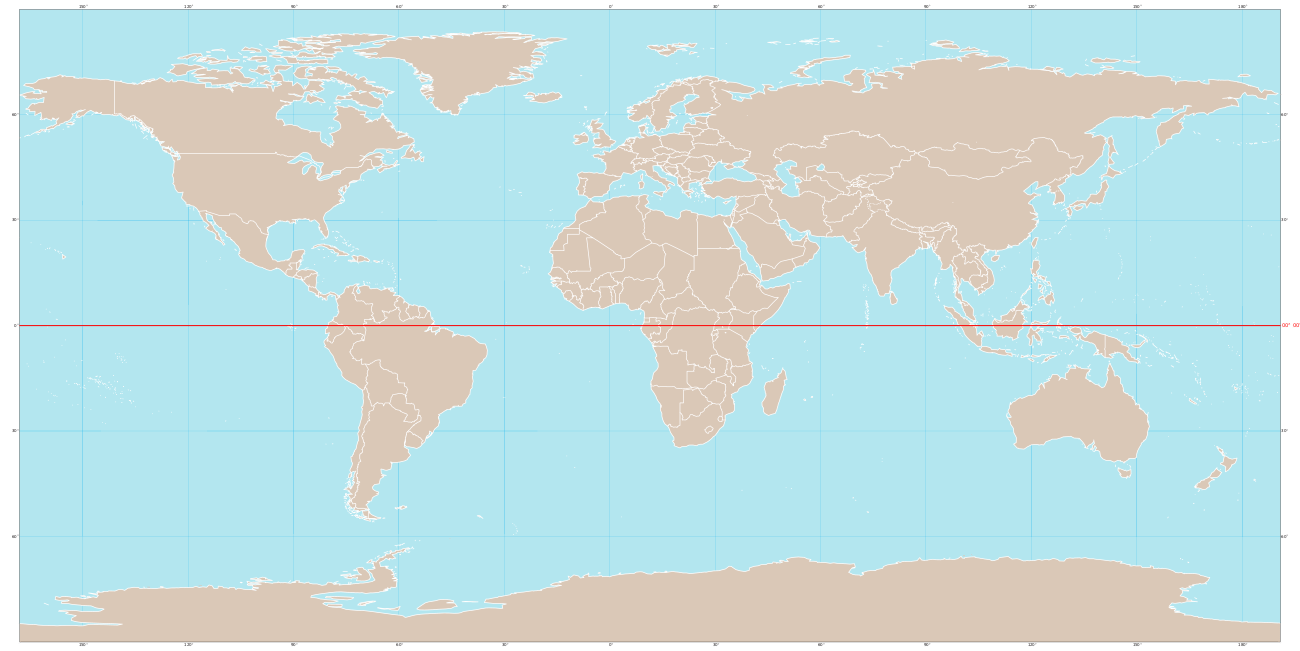圖中穿越地圖的紅線即為赤道。根據美國地質學家的預測,明年強震發生的位置會接近赤道,在北緯或南緯 30度內。