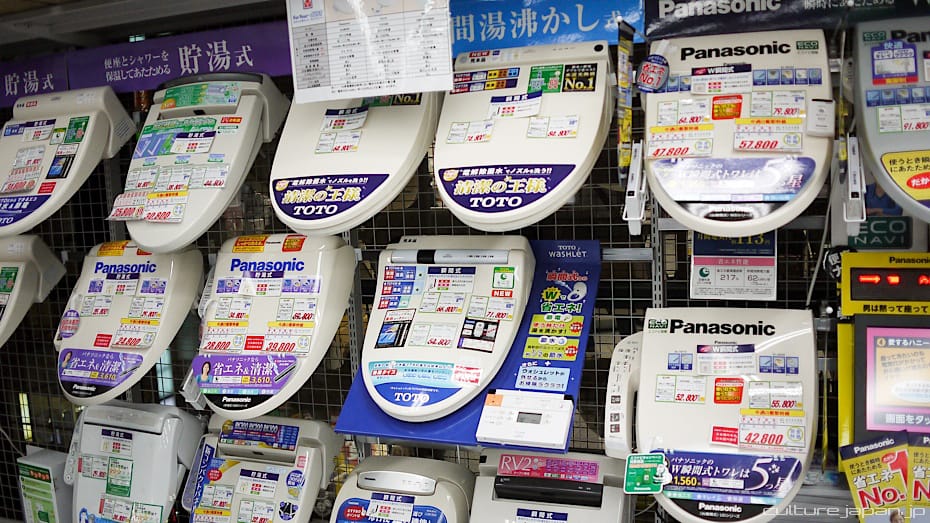 在日本一家電器行中,展示了各大廠牌的免治馬桶座。目前,日本家庭裝免治馬桶座的比例已經超過 70%。