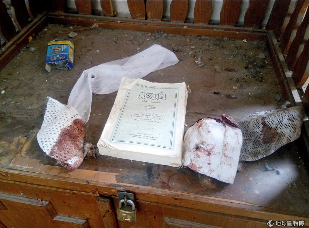 在遭到恐攻的拉瓦達清真寺內,放著一本可蘭經和染血的布條,爆炸現場一片狼藉。