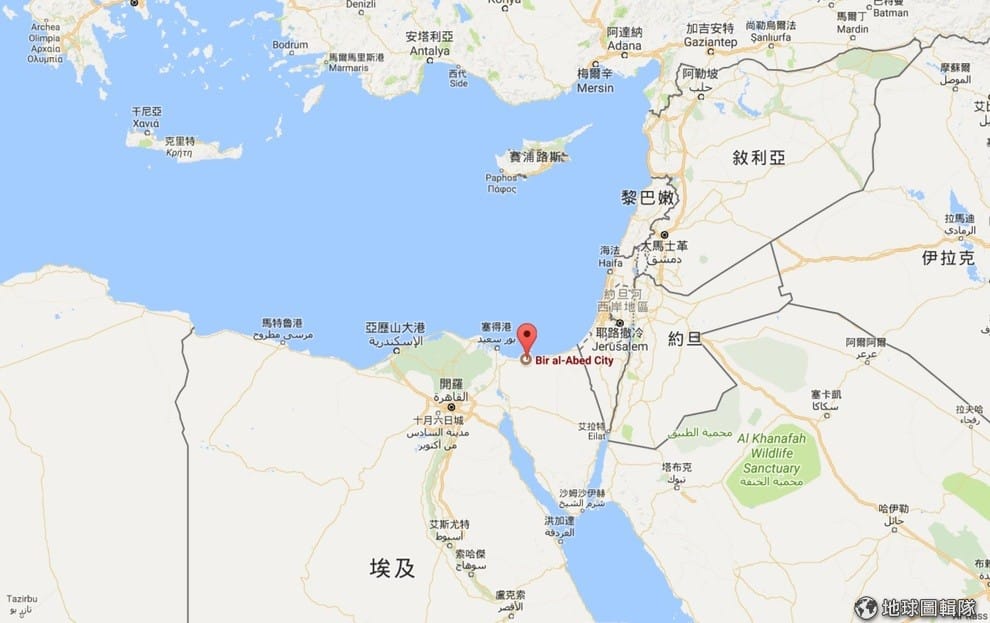 路透社圖中紅色地標處是位於埃及西奈半島北部的阿貝德鎮,遭到血洗的蘇非教派拉瓦達清真寺就位於阿貝德鎮附近。
