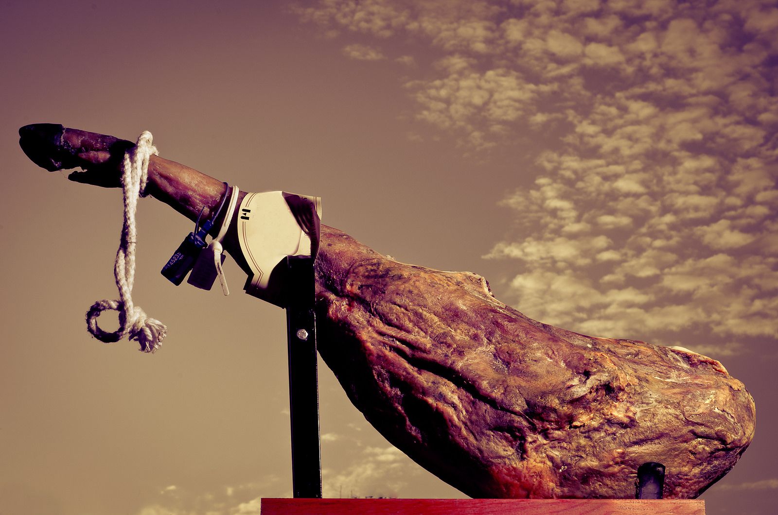 取下風乾好的伊比利亞火腿後,怎麼切成一片一片也大有學問。人們會把伊比利亞火腿整隻放在特製的火腿架(jamonero)上固定,然後用一把長刀小心翼翼地將伊比利亞火腿切片。