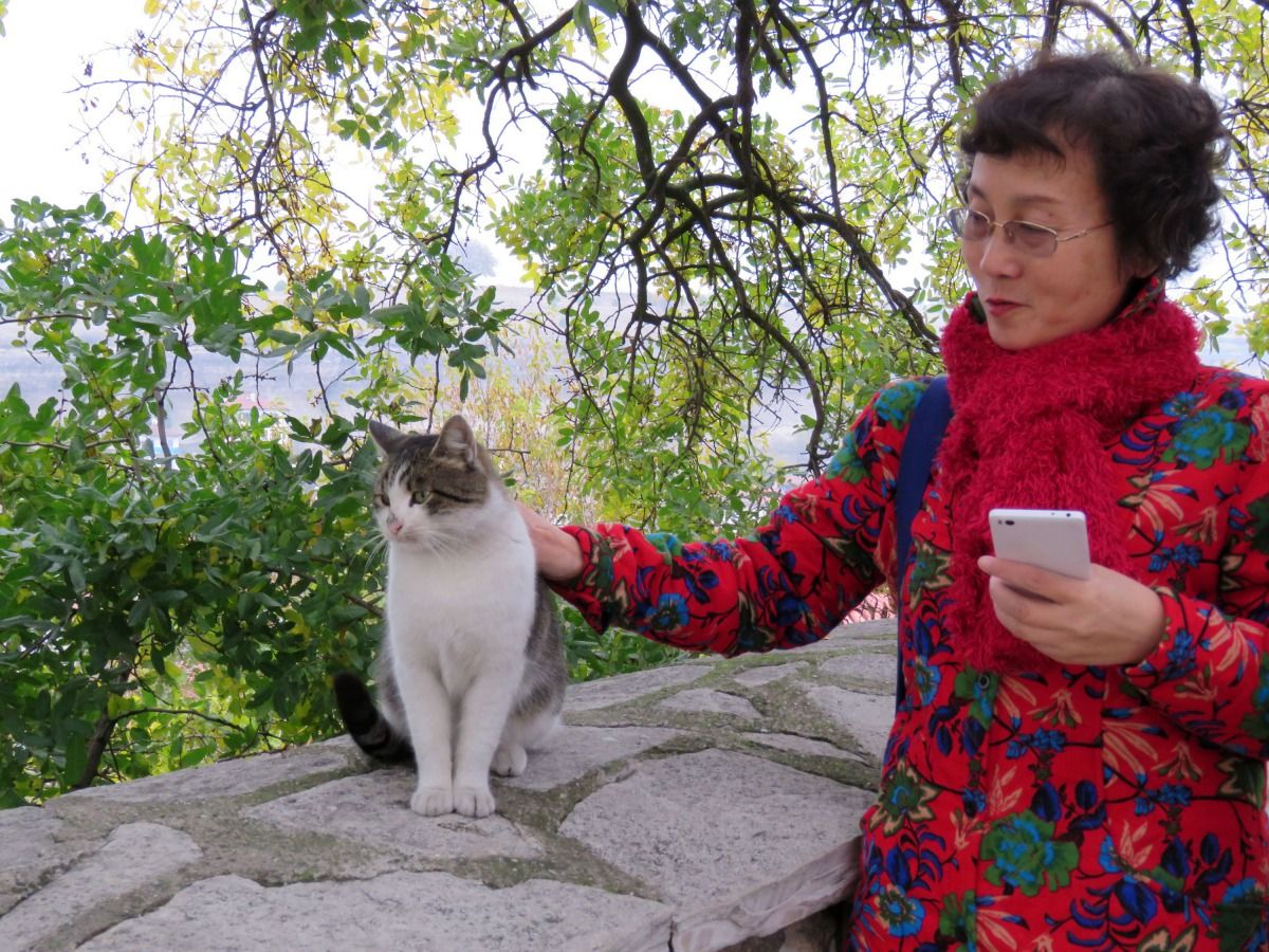 這隻貓向合照的遊客撒嬌磨蹭,引來許多人圍觀拍照。