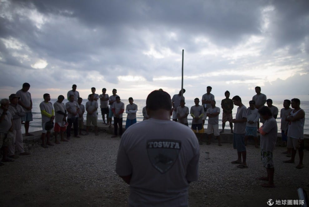 地球圖輯隊清晨時,當地的海岸保育隊(TOSWFA)聚集在一起禱告。