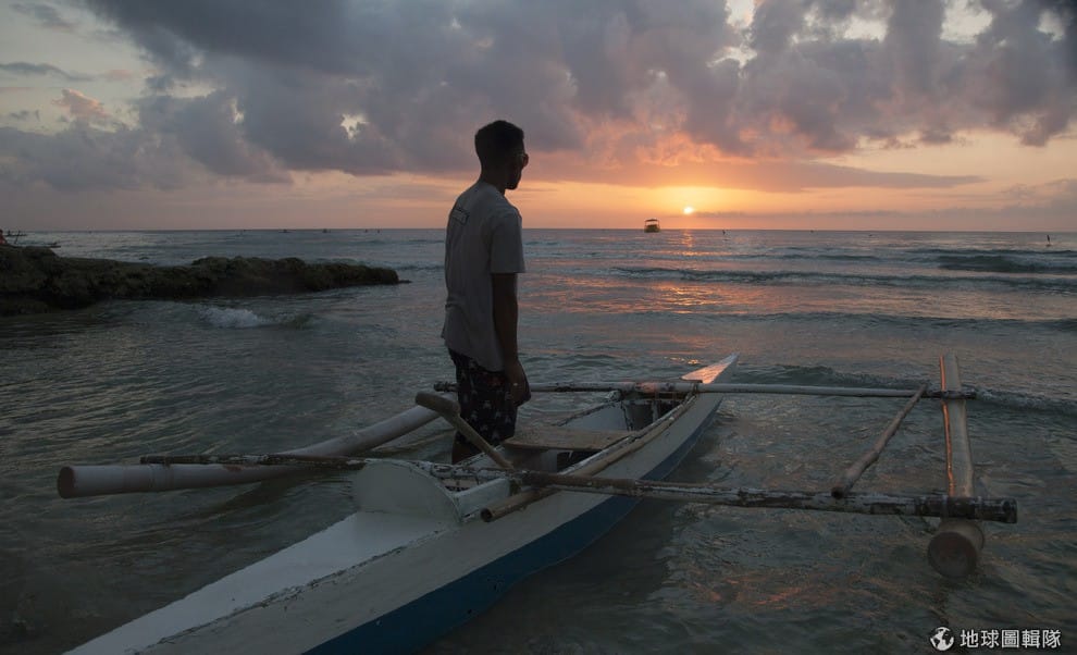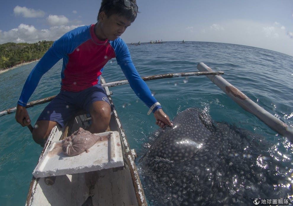 路透社坐在人力船上的魚夫是16歲的洛伊,他正小心地把討吃的鯨鯊寶寶推開船邊。