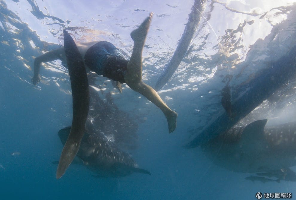 來自世界各地的遊客開心地跟鯨鯊共游大海。