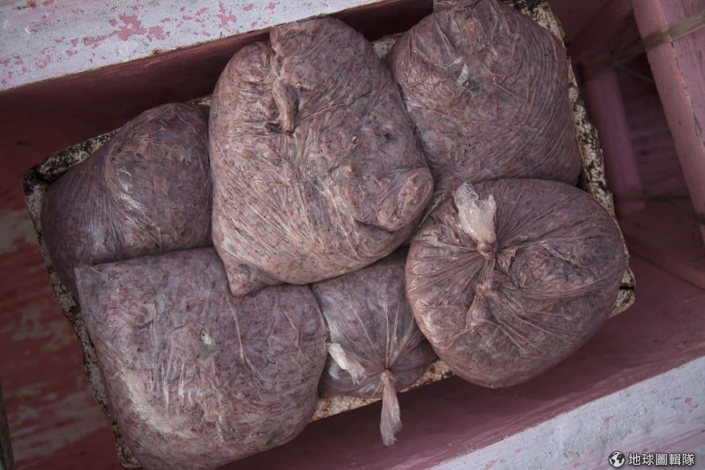 路透社紅紅的袋裝物,就是待會要餵給鯨鯊的飼料。