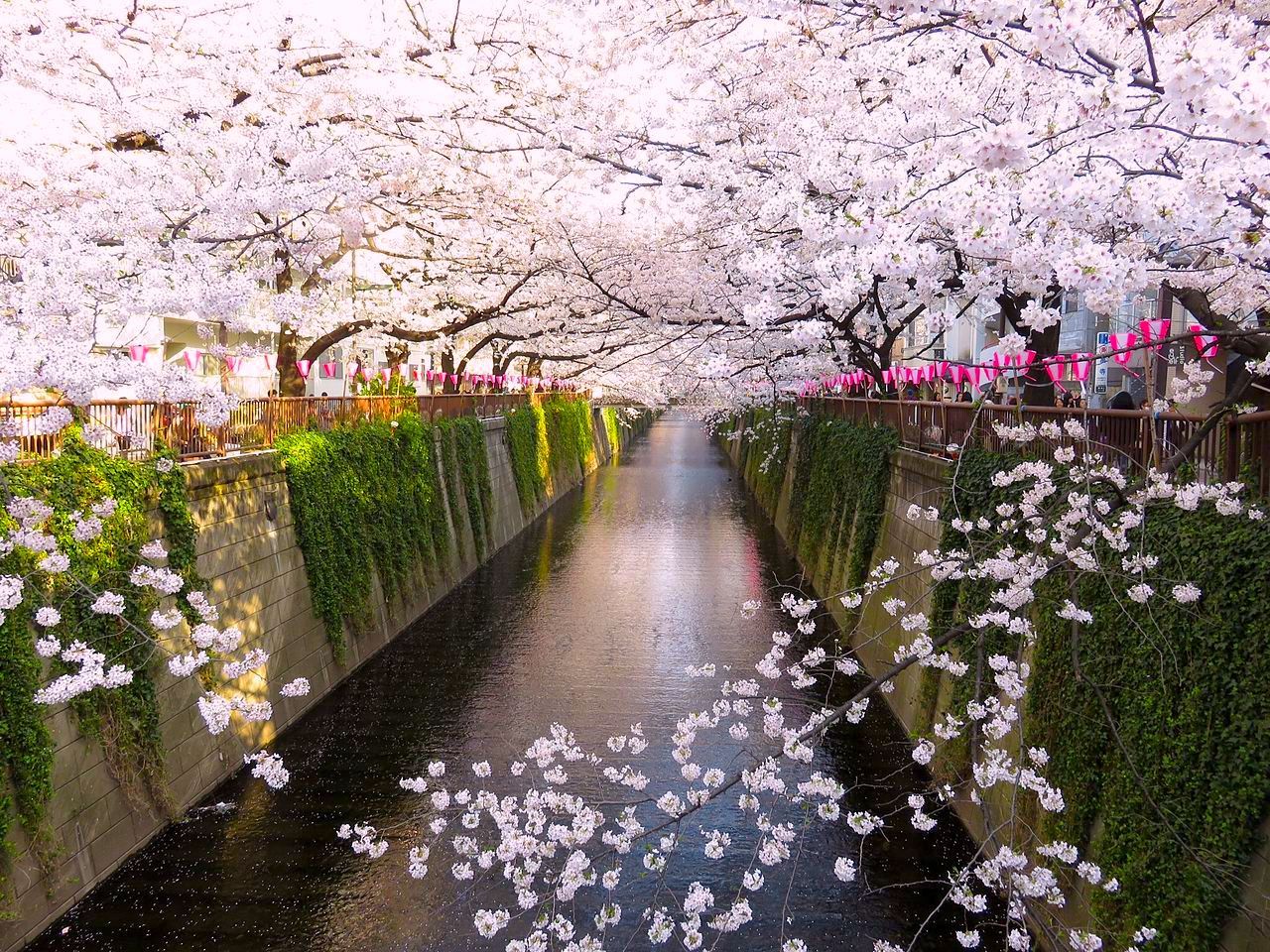 圖為 2014年4月,目黑川櫻花滿布的模樣,點點繁花可說讓人目不暇給。