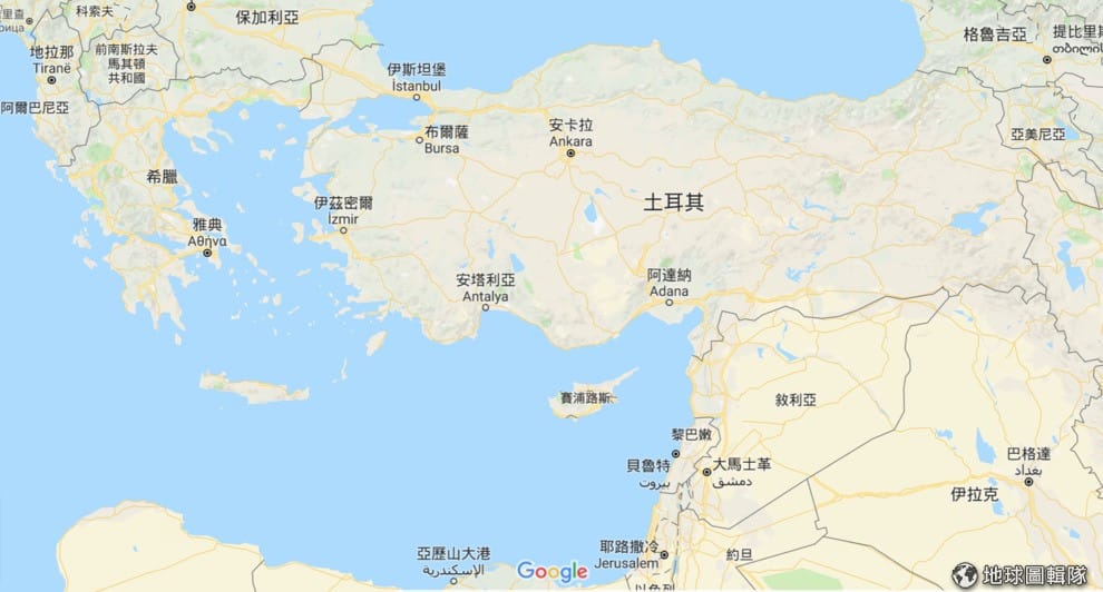 圖為土耳其與希臘的位置圖,兩國對於愛琴海上的島嶼所屬一直有各種爭議,埃爾多安對現行的土希邊界似乎也有意見。在土耳其下方、敘利亞左方的即為賽普勒斯。