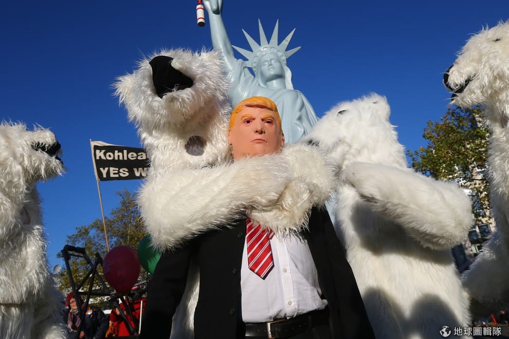 今年 11月,在舉辦聯合國氣候變遷會議的德國波昂(Bonn),環保人士打扮成北極熊,一把掐住扮成美國總統川普(Donald Trump)的抗議人士,一起呼籲大眾重視氣候變遷帶來的危險。