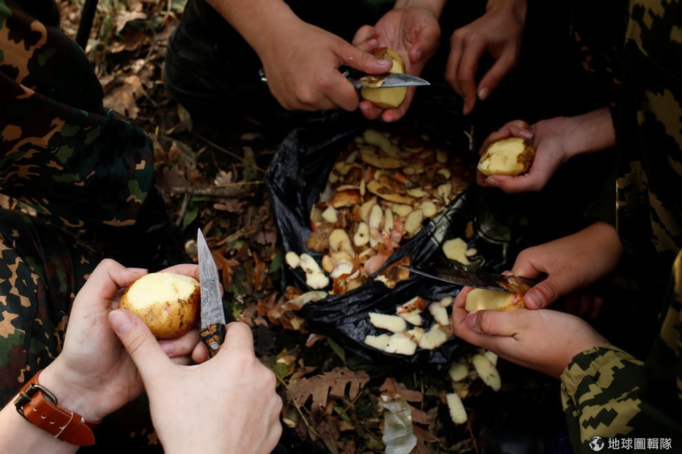 路透社野炊也是於葉爾洛莫夫軍校野外訓練不可或缺的一環,學生們忙著拿小刀削馬鈴薯。