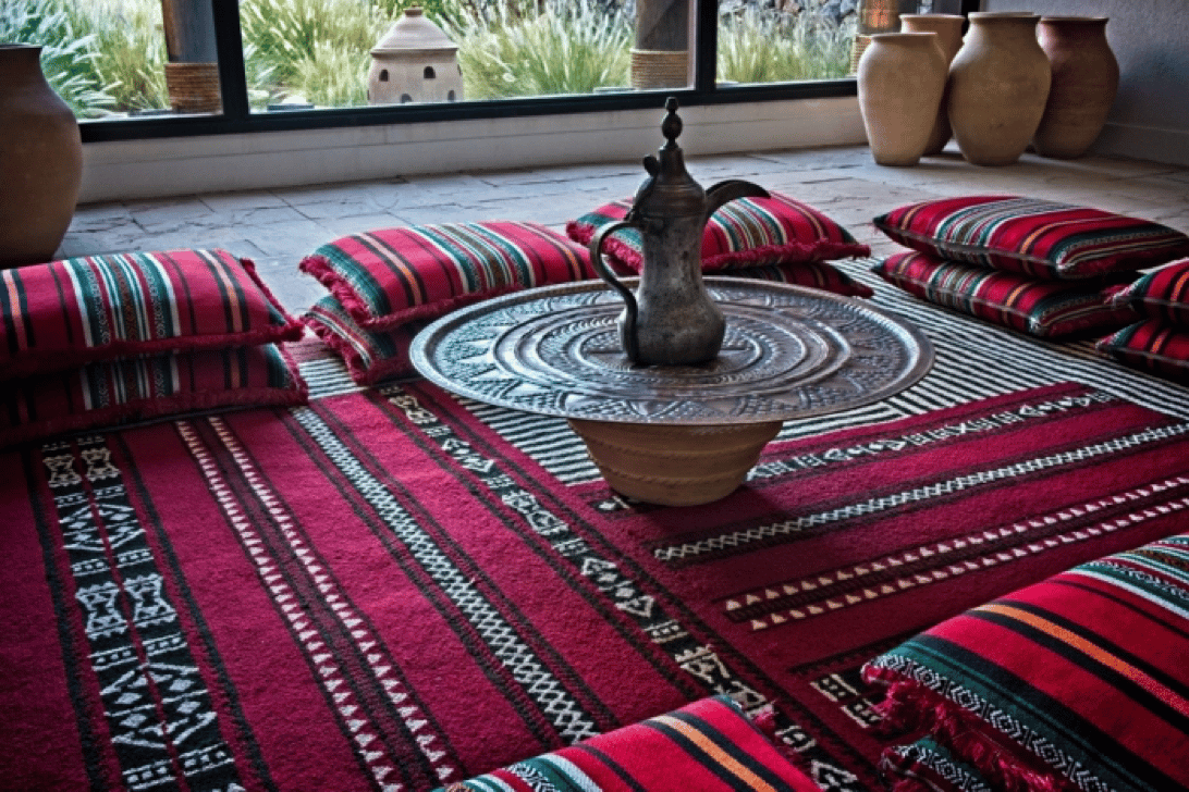 如果有機會參觀阿聯酋的舊宮殿(國父Sheikh Zayed的故居),會發現在不大的宮殿中,有一間獨立的咖啡房,讓侍從們可以隨時準備咖啡,這是阿拉伯人傳統的交誼廳、招待廳,稱之為「Majlis (مجلس)」。舊宮殿裡的Majlis中間會擺著煮咖啡的器具,房間周圍圍繞著布織的靠墊以及坐墊,酋長與他的客人們會直接坐在地板上,一邊聊天一邊享用著咖啡。