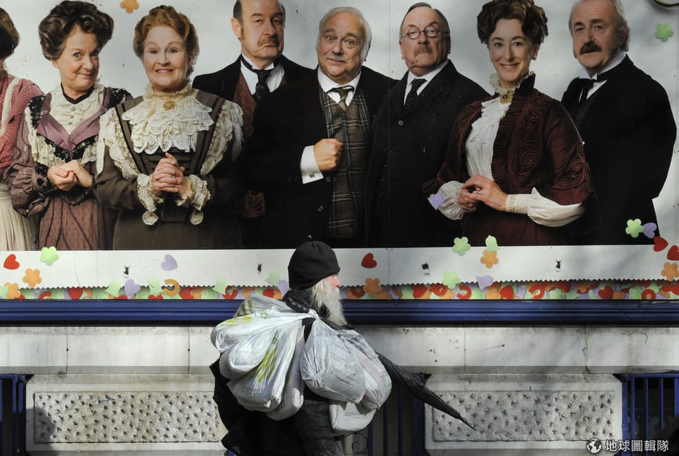 在倫敦街頭,一名無家可歸者提著大包小包,經過劇院看板底下。