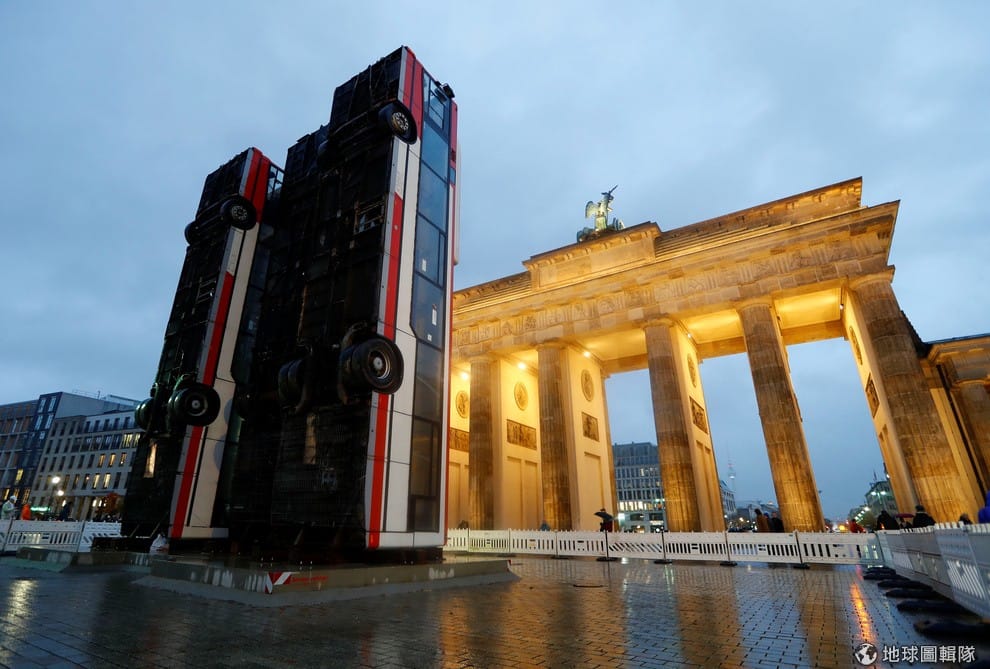 今年 11月,德籍敘利亞藝術家哈布尼(Manaf Halbouni)在柏林布蘭登堡門(Brandenburg Gate)前立起了巴士,用來模仿在敘利亞阿勒坡城(Aleppo)阻擋狙擊手的城牆。