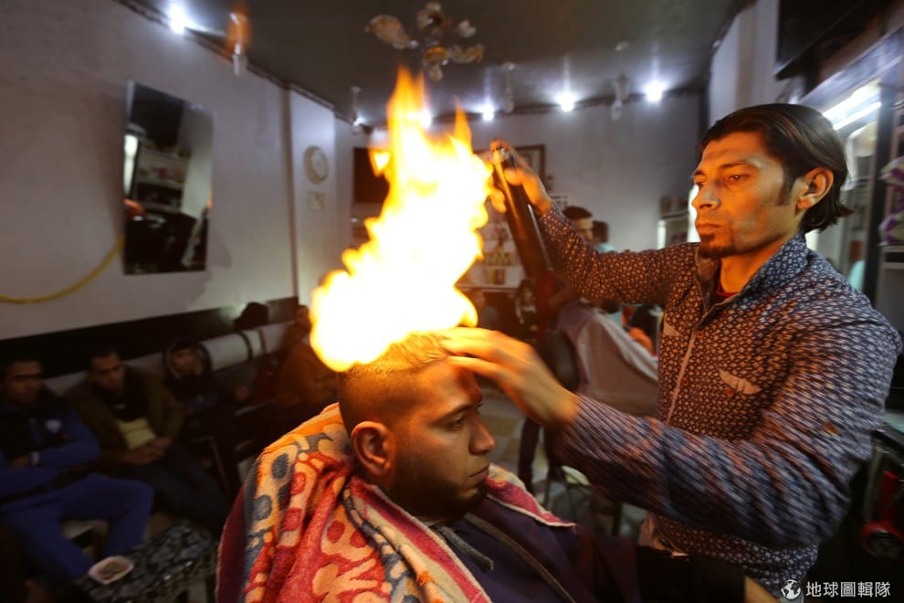 理髮師歐德文(Ramadan Odwan)在顧客的頭上點火,用熊熊烈火為客人做造型,高竄的火光點亮了他的面容。