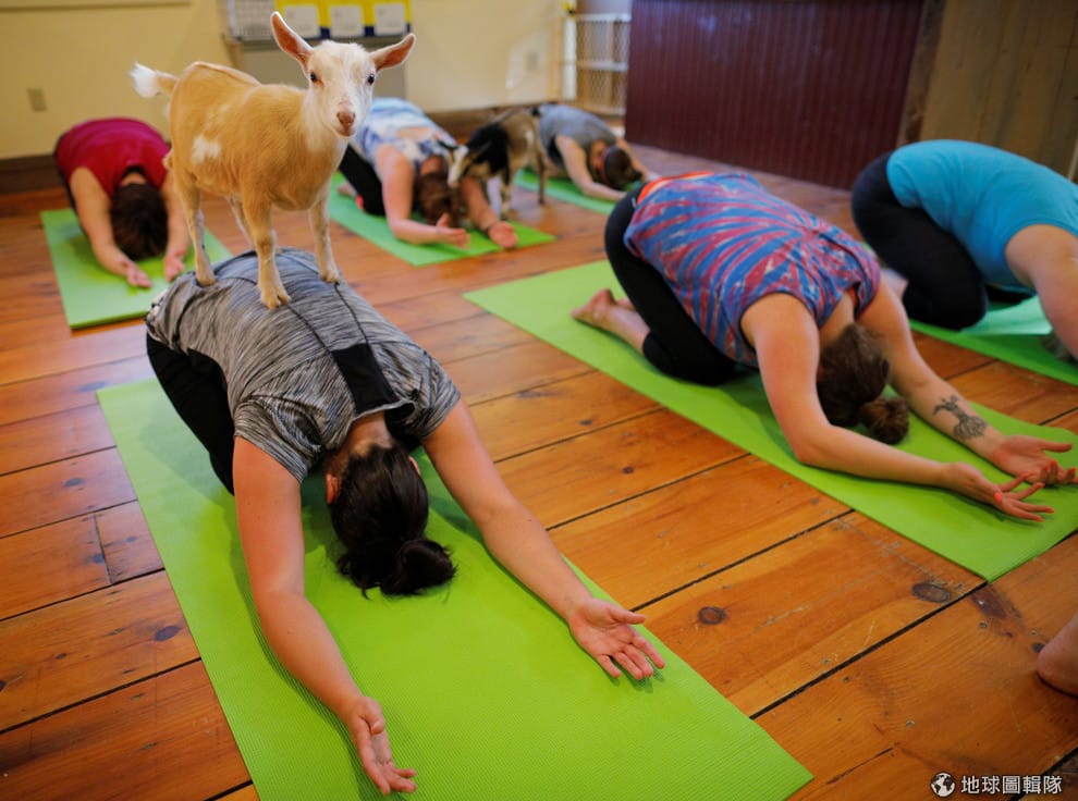 在新罕布夏州的一座農場中,一隻山羊站在正在做瑜珈的學員身上,帶來了不一樣的瑜珈課程。