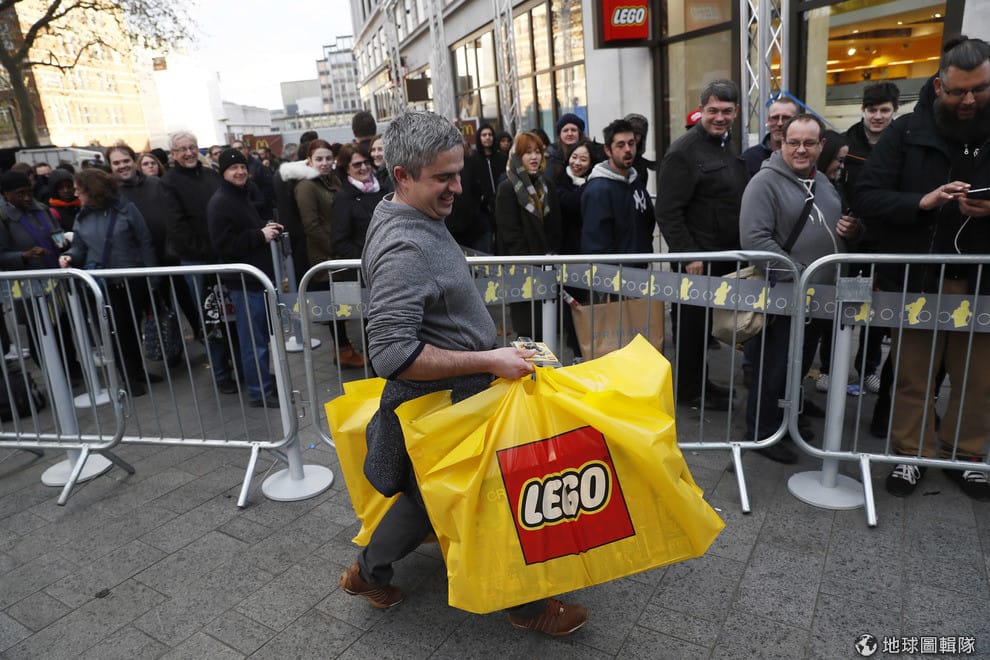 在倫敦的樂高旗艦店前,一名男子手提剛剛買的商品經過還在苦苦排隊的民眾。