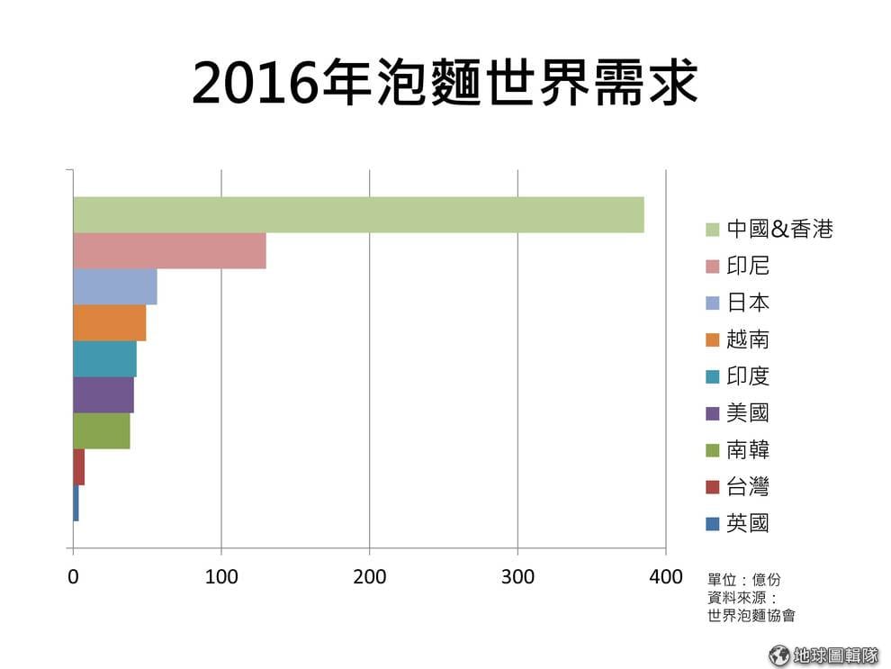 從上圖可以看到,中國 2016年的泡麵需求之大,佔據全球第一,共有 385.2億包。在台灣方面則是 7.7億包。