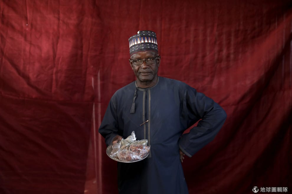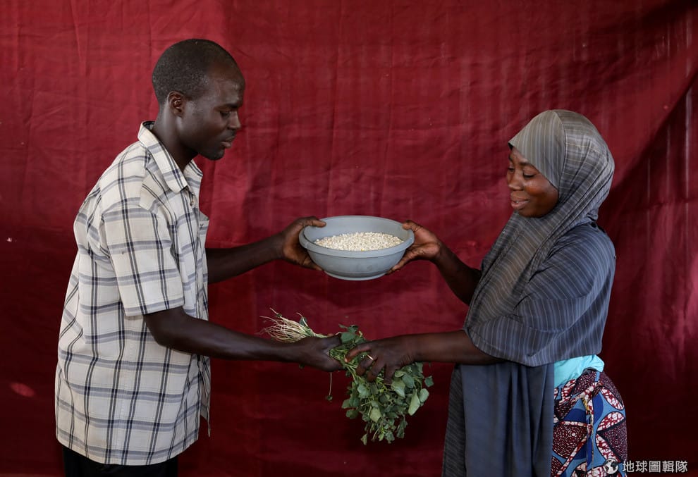 布巴(Nasiru Buba,右)手拿一串小包裝的洗衣精換一盤花生。布巴在城市裡當搬運工,他趁著工作之餘跑去買了洗衣精來換花生。他說:「我太太剛生完沒有奶,我需要拿花生給她吃好發奶,但是我沒有錢。」