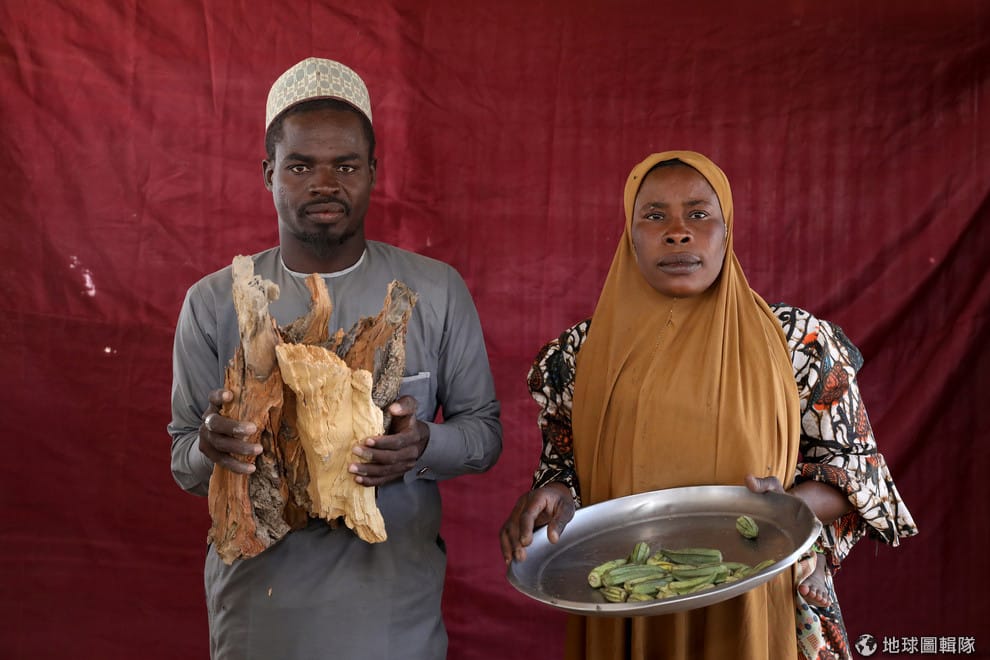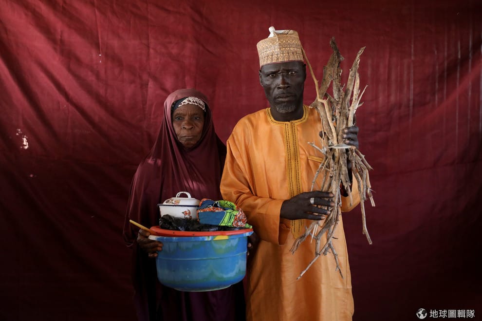 烏瑪如(Aisha Umaru,左)手上拿著牛奶,站在她身旁的卡司其(Umaru Usman Kaski,右)則拿著柴薪,在收容國內流離失所者的難民營內,他們靠著以物易物過生活。