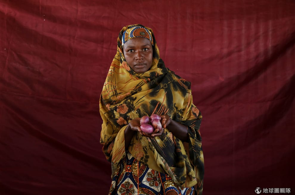 阿杜(Aisha Alhajji Audu)手裡拿著紅色的小洋蔥,希望可以順利換到想要的物資。