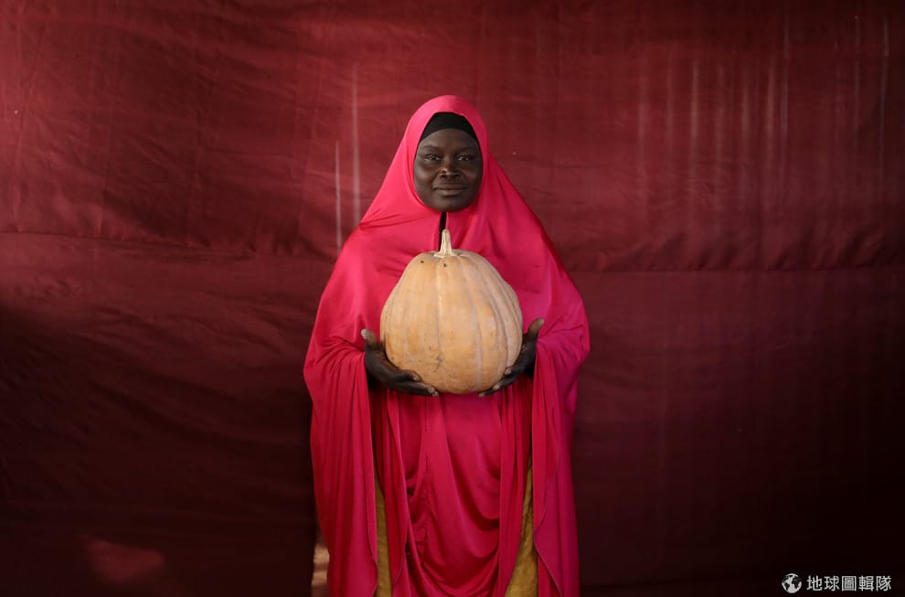 路透社蓋亞(Aisha Umaru Gaye)手上捧著的一顆大南瓜,或許可以換到餵飽一家老小的其他食物。