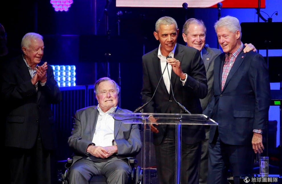 2017年 10月,5名美國前總統一同出席賑災音樂會,為那些因為颶風受到影響的人們募款。畫面從左到右分別是美國前總統卡特、老布希(George H.W. Bush)、歐巴馬(Barack Obama)、小布希(George W. Bush)與柯林頓。即刻發動核武是美國總統獨有的權限,也只有美國總統可以這麼做。