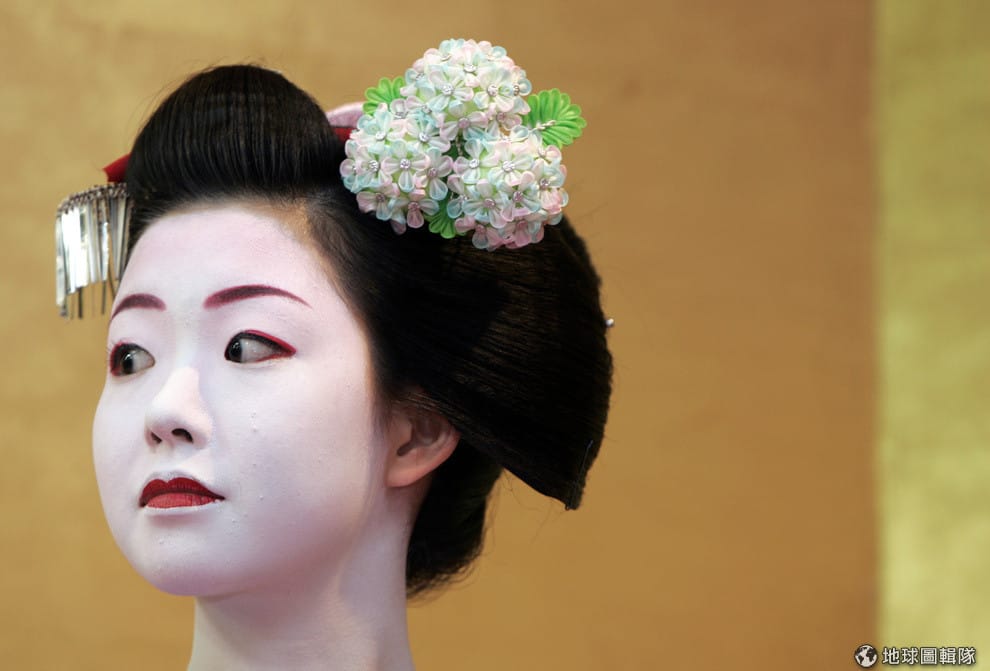 2007年,一名藝妓學徒坐在舞台前方,等著表演日本傳統的茶道技藝。