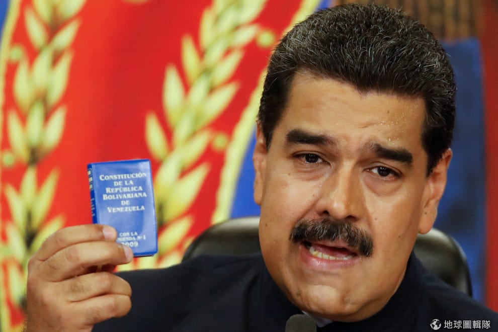 圖為委內瑞拉總統馬杜洛,他在去年 10月的記者會上拿出一本迷你憲法。面對國內的經濟危機,馬杜洛希望加密貨幣「Petro」的發行可以把委國從泥淖中救出。