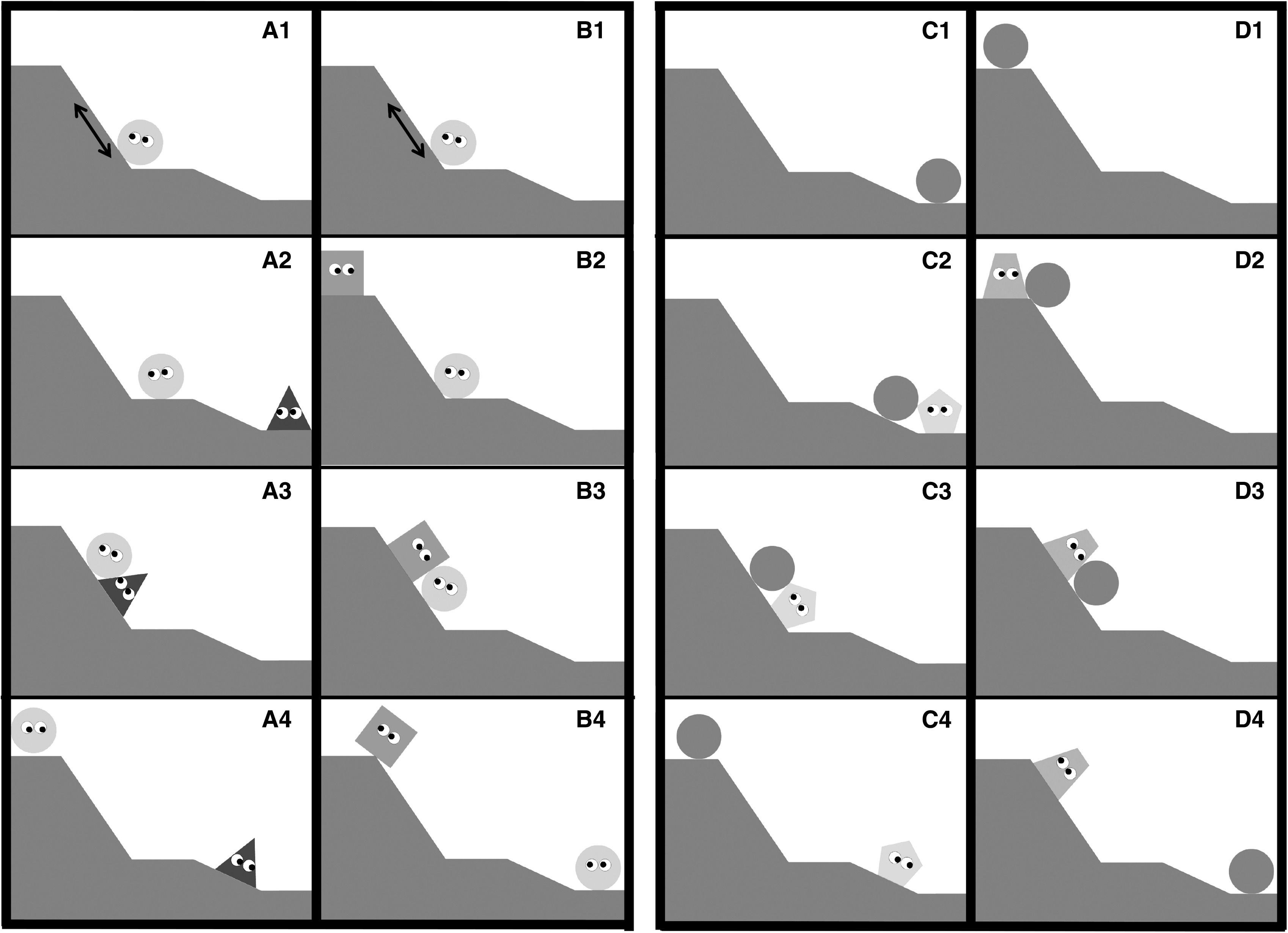 首先,在第一個實驗中,研究人員給 24隻倭黑猩猩看了一部動畫片,片中有個長得像小精靈(Pac-Man)的角色想要爬到山頂,另一個好角色會幫它一把,而另一個壞角色則會想辦法把它拉下來。