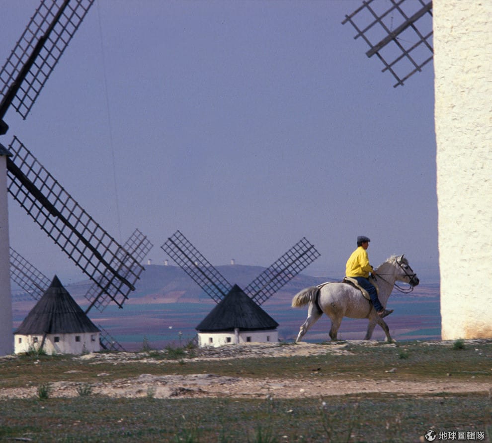 一名男子騎馬經過卡斯提亞-拉曼查的風車。這裡因為西班牙小說《唐吉訶德》而聲名大噪,風車也成為這裡的著名地標。