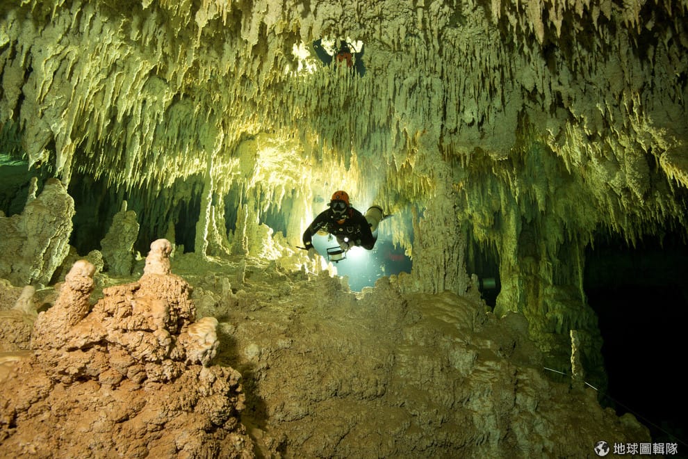 在「白色洞穴」內,一名潛水員正在觀察落在洞穴裡的動物骨頭。