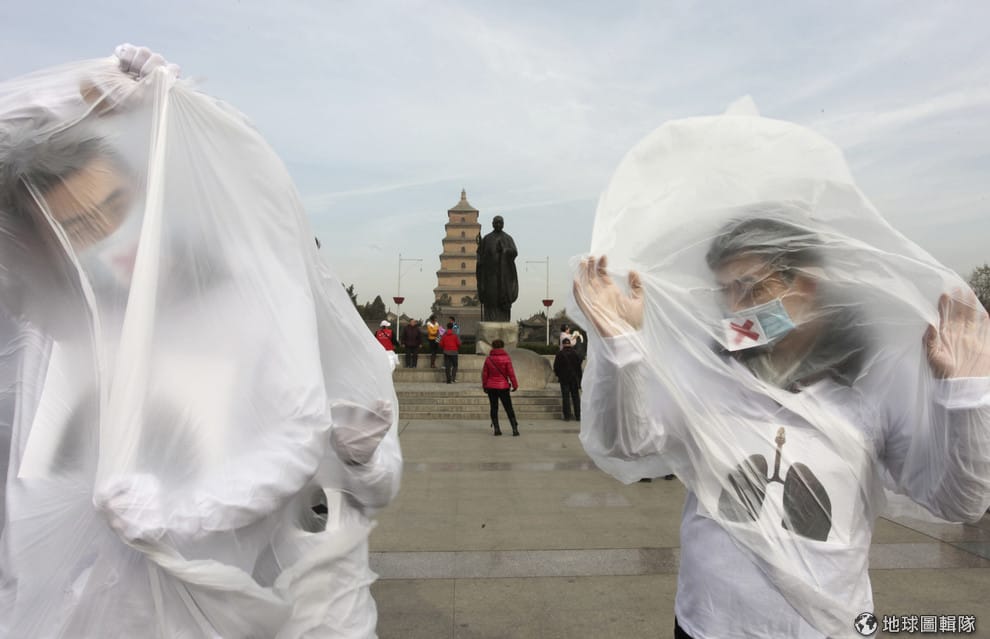 2013年,一群大學生在西安市用塑膠袋套頭,藉著這樣的行動藝術希望讓大家更注意空汙有多危險。