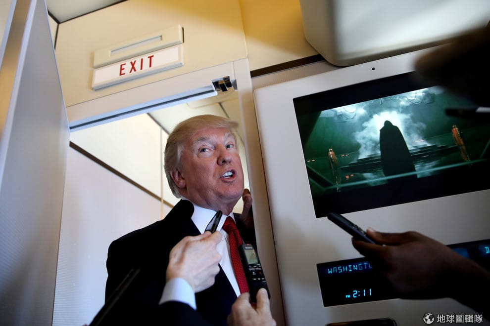 美國總統川普表示,並不是所有的新聞都是假新聞,美國還是有值得尊敬的記者和好新聞。圖為他去年 4月在空軍一號班機上接受媒體採訪的畫面。