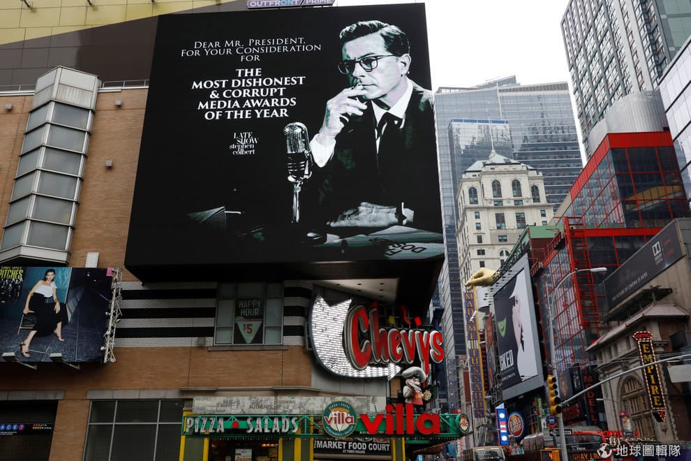 在紐約時代廣場上,CBS深夜脫口秀「荷伯報到」向川普毛遂自薦,希望他下次考慮讓他們拿獎。