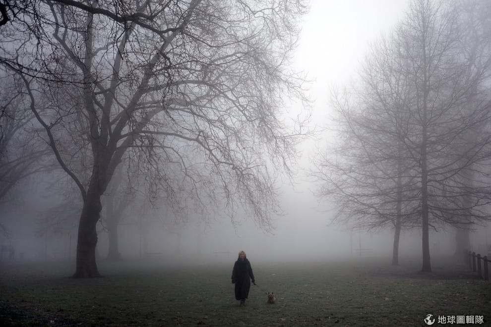 在倫敦的帕森綠地公園,一名女子在霧氣瀰漫的公園中帶狗散步著。