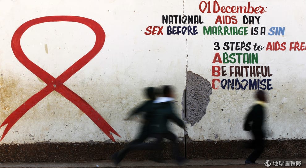 2011年 8月,一群南非孩童跑過了畫有愛滋宣導壁畫的小學牆面。