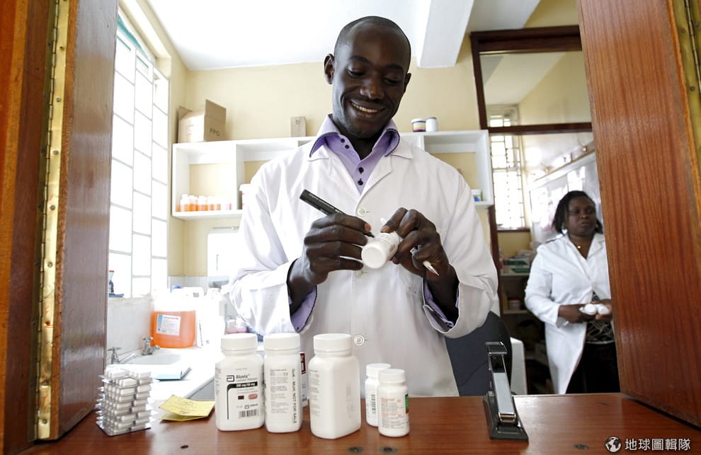在 2015年9月的肯亞,一名藥劑師正在分配抗反轉錄病毒藥物。目前仍沒有根除HIV病毒的方法。
