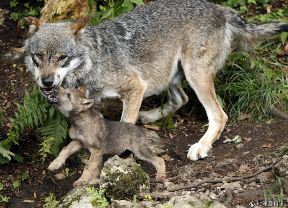2009年在瑞士的村落,一隻母狼正在和牠的孩子玩耍。