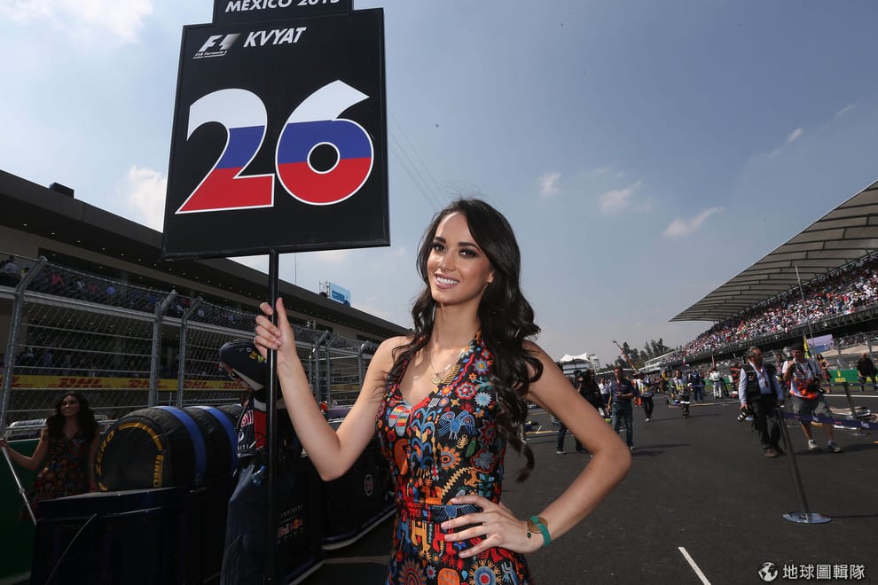 2015年,在墨西哥一級方程式大獎賽上,一名賽車女郎舉著牌子在鏡頭前留影。